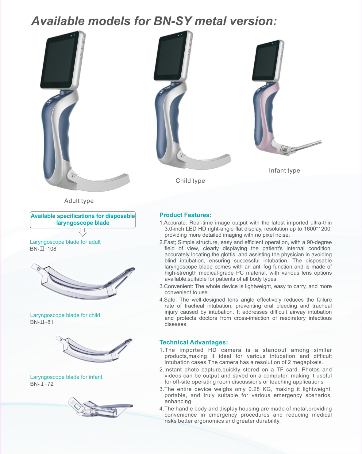 2.Efficient: Features a simple structure for easy and smooth operation, with a 90° lens field of view that clearly shows the patient’s internal conditions, enabling accurate glottis localization. It assists clinicians in avoiding blind intubation and completing intubation successfully. The disposable laryngoscope blade comes with a built-in anti-fog function and is made of high-strength medical PC material. Multiple blade options are available, suitable for patients of all body types.